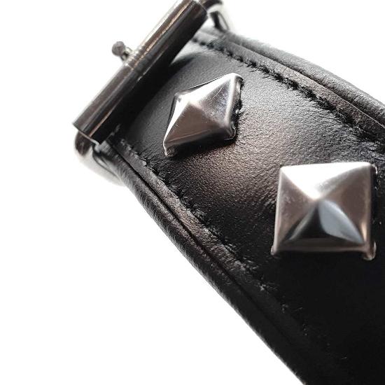 Coleira em pele com rebites planos e anel o-ring de vedação frontal.