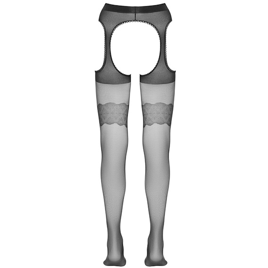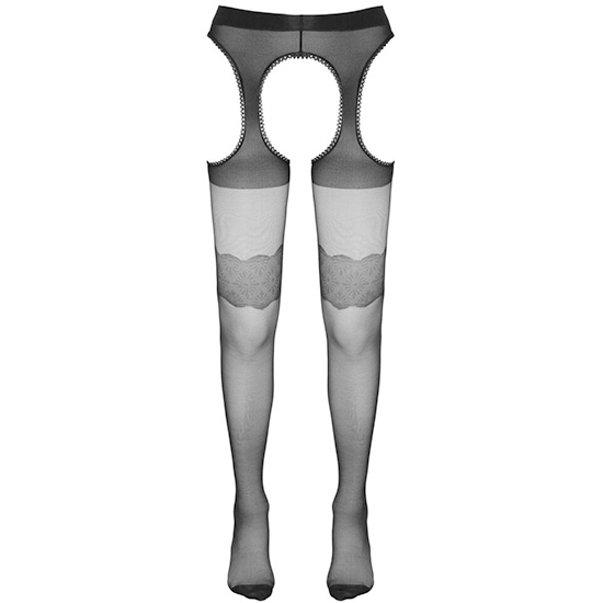 Collants elegantes com recortes nas laterais e uma virilha aberta e atraente. As ligas costuradas também chamam a atenção de forma sexy.