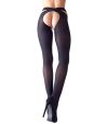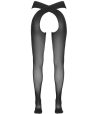Meia-calça preta com tira cruzada na cintura. Abertos na virilha.