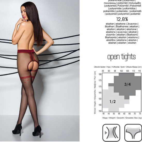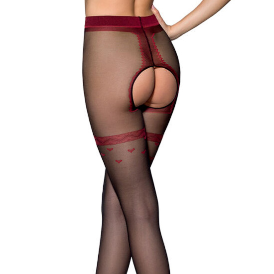 Sedutores e convidativos collants pretos com detalhes em vermelho e decorados com corações nas coxas. Obviamente abertos na virilha para momentos excitantes e eróticos.