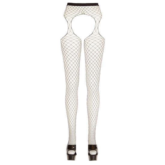 Collants muito extensíveis em rede larga preta, com corte de ligueiro e suspensores.