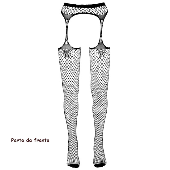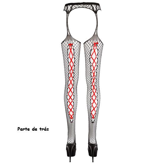 Collants convidativos em rede larga preta muito extensível, com laço atrás cruzado vermelho.
