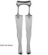 Collants convidativos em rede larga preta muito extensível, com laço atrás cruzado vermelho.