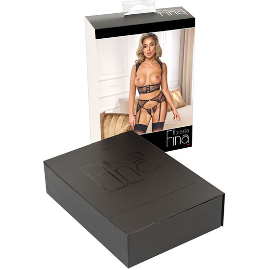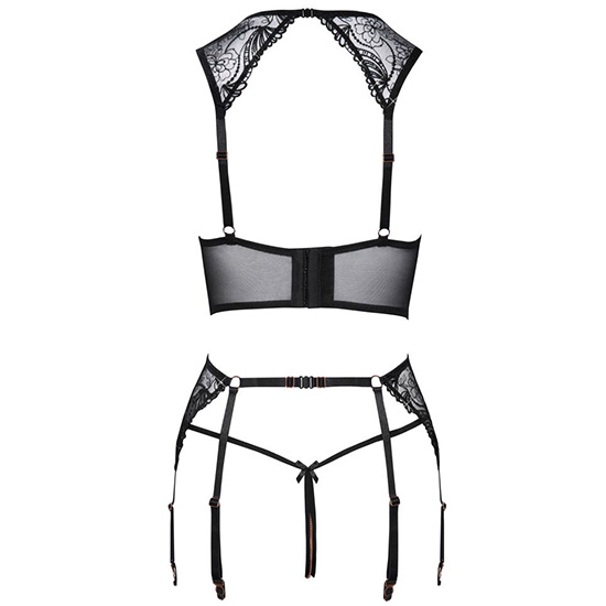 A tanga-string aberta, o top bustier e a cinta-liga estão neste elegante e erótico conjunto de suspensórios da Abierta Fina.