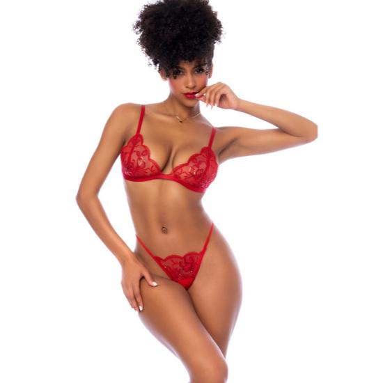 O conjunto de três peças inclui um bralette com alças ajustáveis, uma cinta-liga e uma tanga a condizer.
