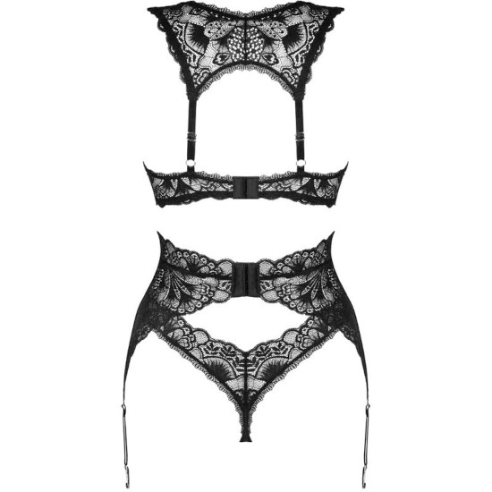 - Um conjunto de três peças preto que inclui um sutiã, uma tanga e uma cinta-liga