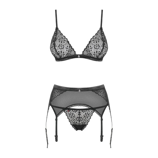 Este conjunto é composto por: sutiã, cinta-liga e tanga de renda