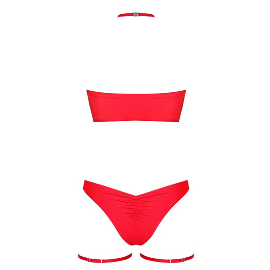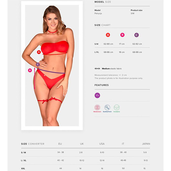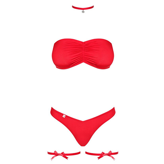 O conjunto de lingerie vermelha, Kissmas da Obsessive, contém uma gargantilha, um soutien cai-cai sem alças, cuequinha de cintura subida e 2 ligas.