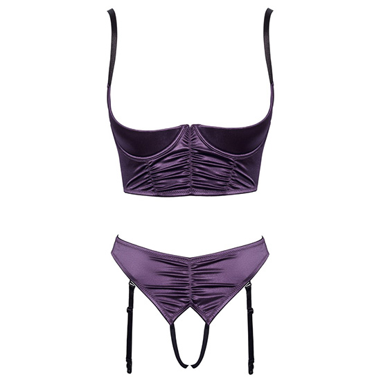 Sutien aberto com 1/4 copa e tanga com ligueiros sem virilha num conjunto da Cottelli LINGERIE. Feito de cetim extensível lilás escuro num visual elegante e franzido com detalhes em preto.