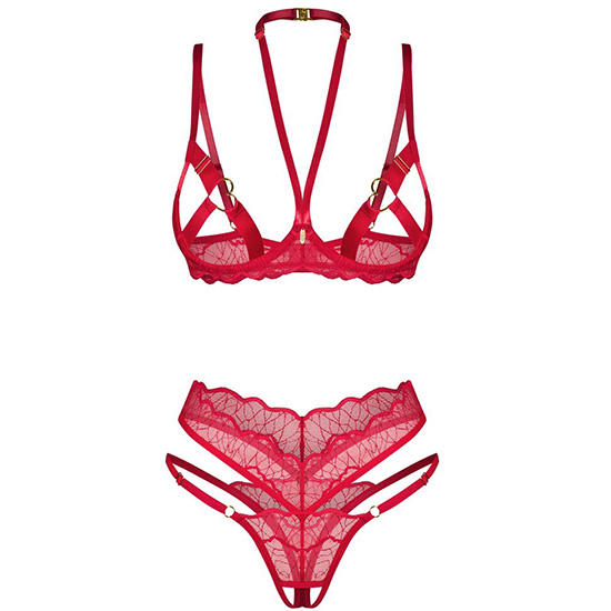 O conjunto tem um aspeto delicado de renda numa sensual cor vermelha com detalhes dourados. É macio e elástico para um ajuste muito confortável. O soutien tem um decote halter moderno e ajustável. Há um discreto detalhe decorativo entre as copas abertas ​​e possuem ainda corações decorativos para os mamilos. As alças do soutien também podem ser ajustadas para se ajustarem à silhueta.