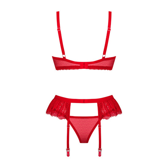 O delicado conjunto Chilisa da Obsessive é composto por sutiã, cinto suspensório e tanga confeccionada em fina renda floral.