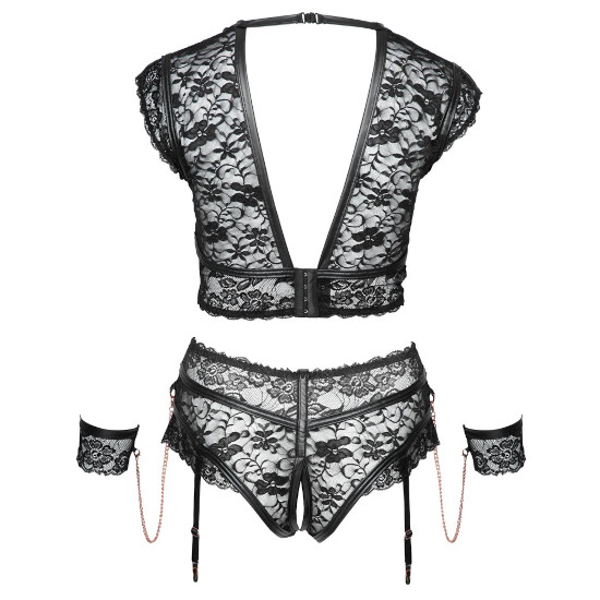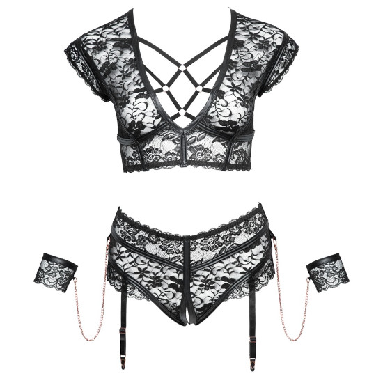 Sutien e cueca com suspensório sem gancho Cottelli BONDAGE confecionada em renda macia e elástica com listras de efeito fosco e detalhes em ouro rosa.