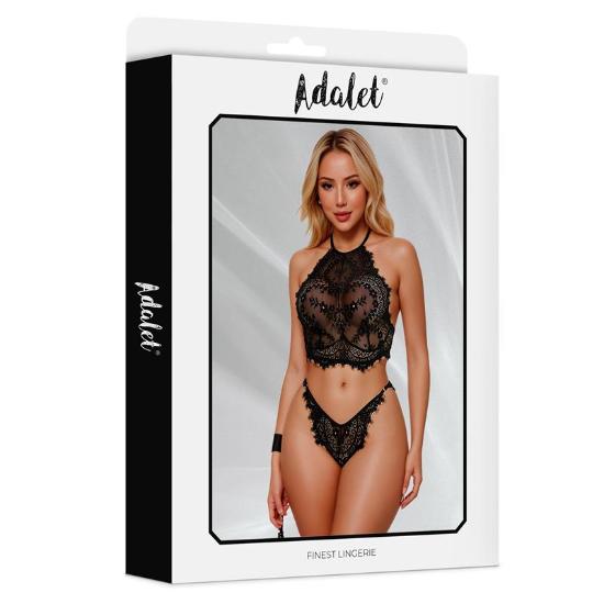 Conjunto de duas peças com um top semitransparente de alças com renda floral e uma tanga a condizer.