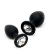 Conjunto de 2 plugs anais de silicone com uma joia redonda transparente na base.