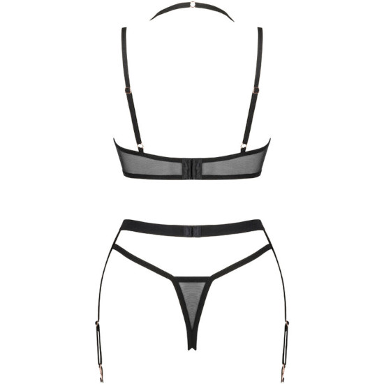 Um conjunto de três peças preto contendo sutiã, tanga e cinta-liga