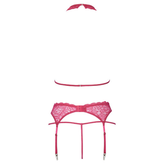 Conjunto de sutiã macio, cinto de ligas e tanga da Cottelli LINGERIE totalmente confeccionado em delicada renda rosa.