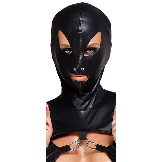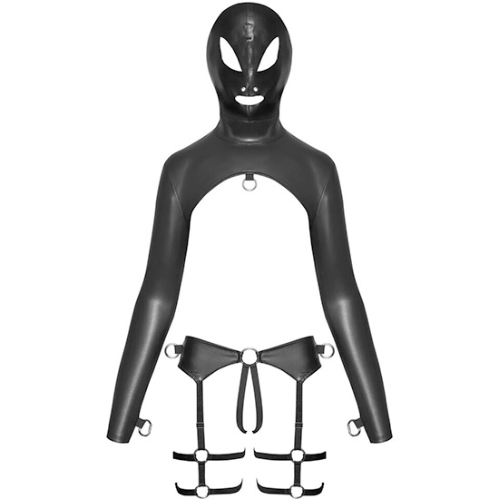 O aspeto preto mate, suave e elegante adere suavemente à pele. O top muito curto mantém os seios e a barriga descobertos. A parte superior também tem uma máscara de cabeça integrada e mangas compridas. Também tem um fecho na parte de trás. Toda a cabeça, pescoço, ombros e braços estão cobertos de uma forma emocionante. Há um anel em D na parte da frente. A máscara de cabeça tem orifícios para os olhos, narinas e boca. As mangas compridas têm fechos de mola na parte inferior.
