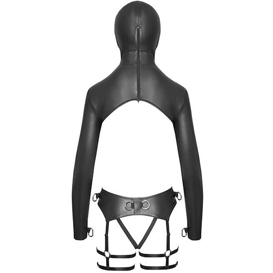 Top curto com máscara de cabeça e cordão de arnês sem entrepernas. Mangas compridas com colchetes Muitos anéis em D para fins de contenção.