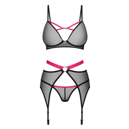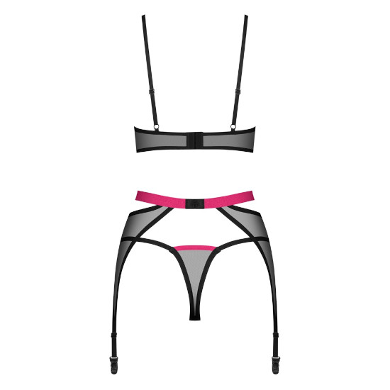 Tudo é feito de delicada powernet preta com detalhes em rosa.