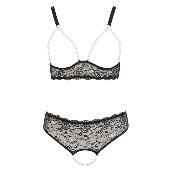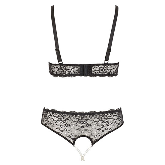 Delicado conjunto aberto em renda bordada floral preto combinada com pérolas da cor do marfim.