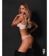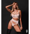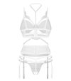 Um soutien com armação, uma cinta-liga e umas cuecas fio dental aberto estão no conjunto Premisis da Obsessive.