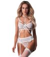 Conjunto: soutien com armação, cinto de ligas e cueca fio dental aberto