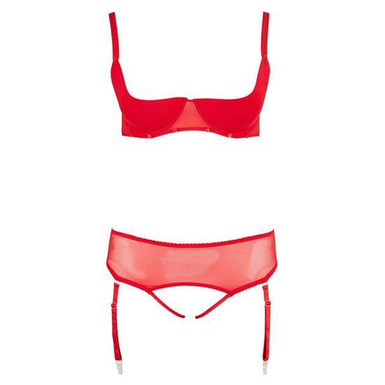 A tanga-string vermelha com suspensores também oferece uma excelente vista, pois a parte da renda na frente pode ser desabotoada e removida. Os quatro suspensores são ajustáveis e removíveis.