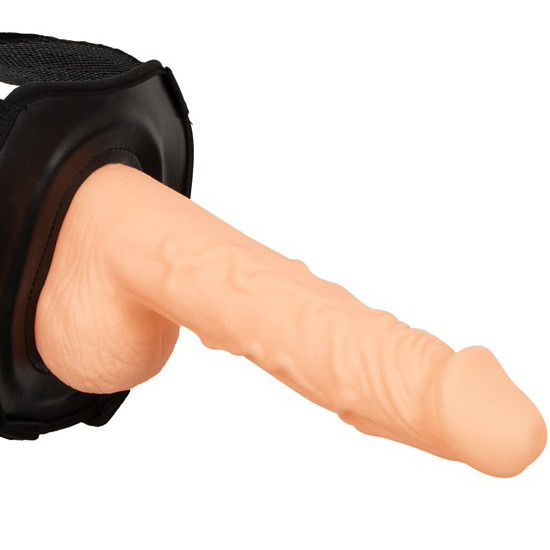 Dildo realístico e oco preso com segurança a um arnês elástico e ajustável.