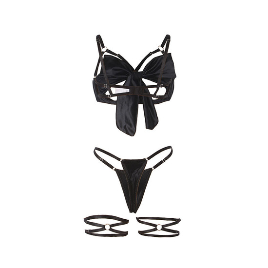 O sutiã tem bojos abertos que valorizam delicadamente o busto, decorado com um laço preto sedutor que acrescenta um ar lúdico e sedutor.