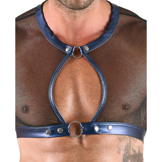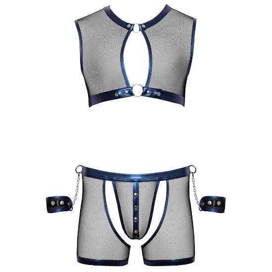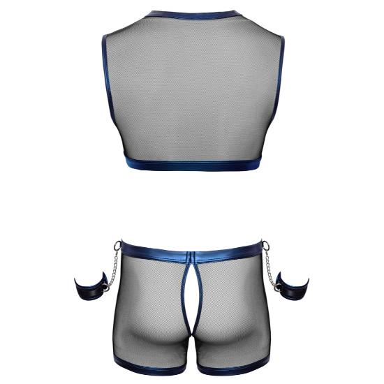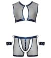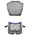 O conjunto é feito de rede preta transparente, macia e elástica, com um bonito material azul metálico com efeito molhado costurado.