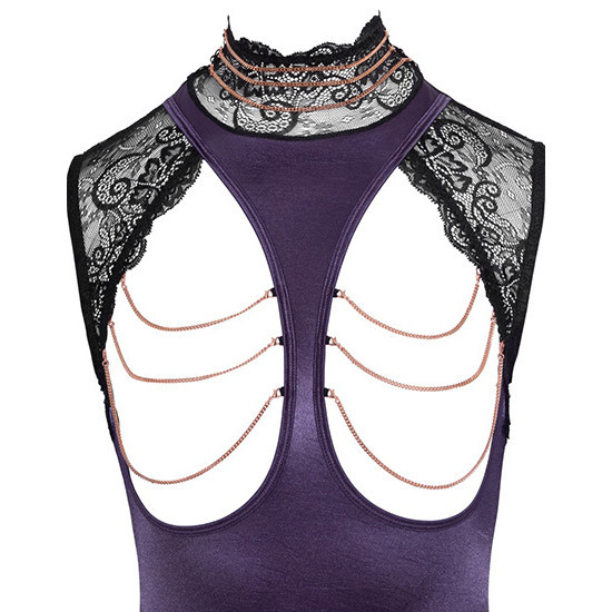 confeccionada em cetim roxo elástico com delicados apliques de renda e