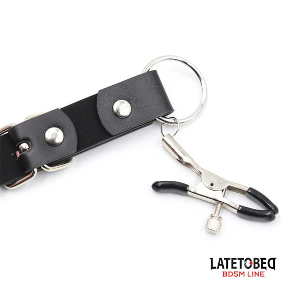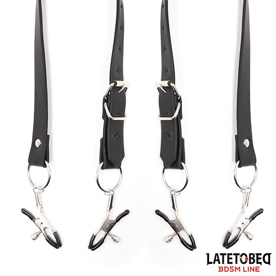 Tenha uma noite ainda mais picante com estas correias de bondage para pernas com pinças de clitóris e lábios vaginais.