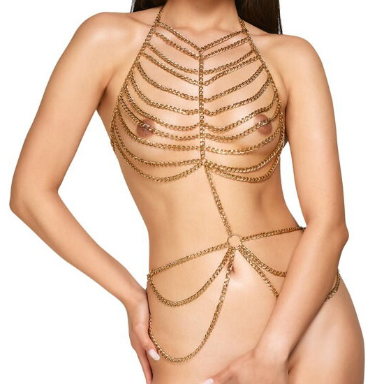 A corrente dourada da Cottelli ACCESSOIRES tem um aspeto de duas peças. Uma luxuosa decoração de correntes nos seios e na parte da frente das ancas.