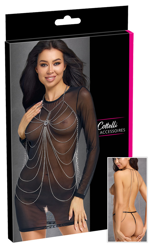 O body chain prateado da Cottelli ACCESSOIRES possui luxuosos detalhes em corrente na parte frontal. Uma gema transparente entre os seios acrescenta um toque especial, tornando-o ainda mais atraente.