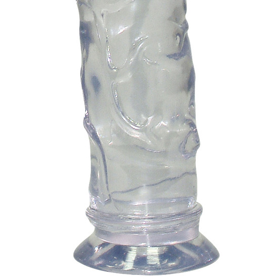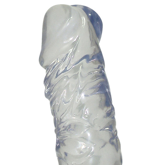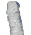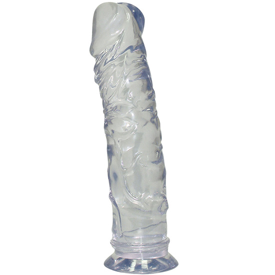 Dildo médio transparente e dobrável do cristal Crystal Clear com veias fortes e cabeça saliente. Com um base maior para poder ser usado com strap-on/arnêses, se desejar.
