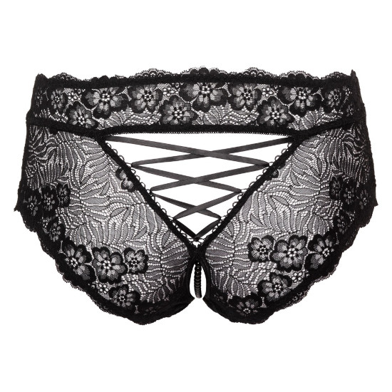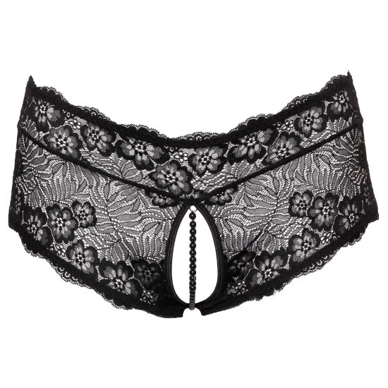 A corrente de pérolas elástica e estimulante na virilha aberta é especialmente engenhosa, assim como o laço de cetim no recorte triangular na parte inferior.