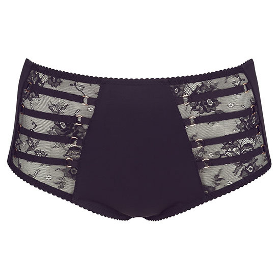 - Cueca preta com encaixes de renda na frente e detalhes no