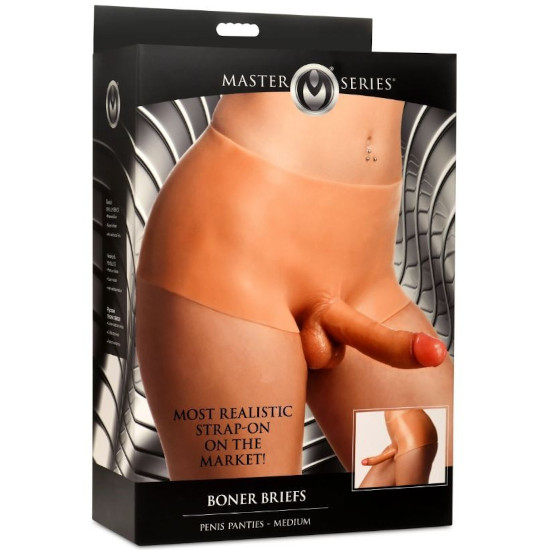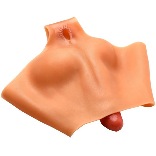 A calcinha de silicone elástica e sem ftalatos tem um dildo realista articulável com testículos na frente.