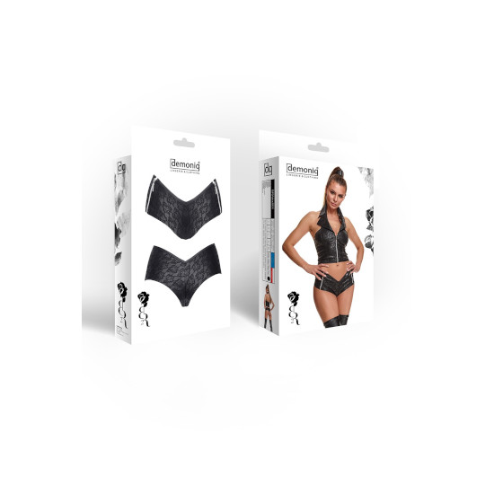 É confeccionado inteiramente em couro ecológico stretch preto com estampa característica.