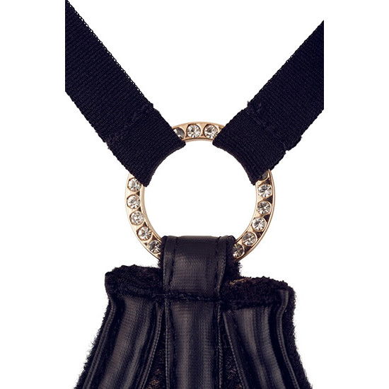 Conjunto de 3 peças em tecido acetinado preto combinado com renda bordada e detalhes em strass metálico.