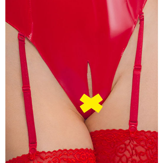 Body de vinil com copos abertos, virilhas convidativas abertas e tiras suspensas amovíveis.