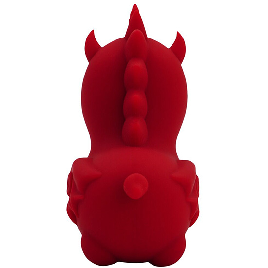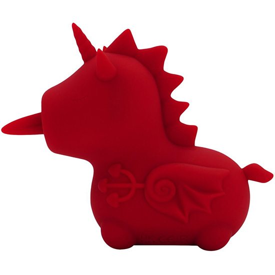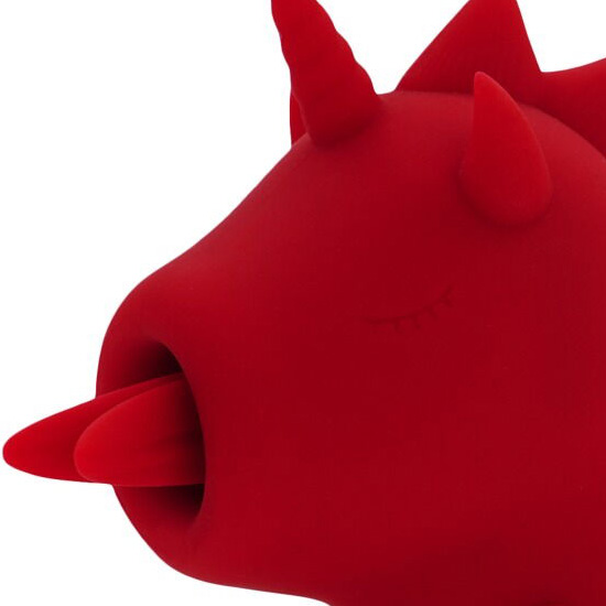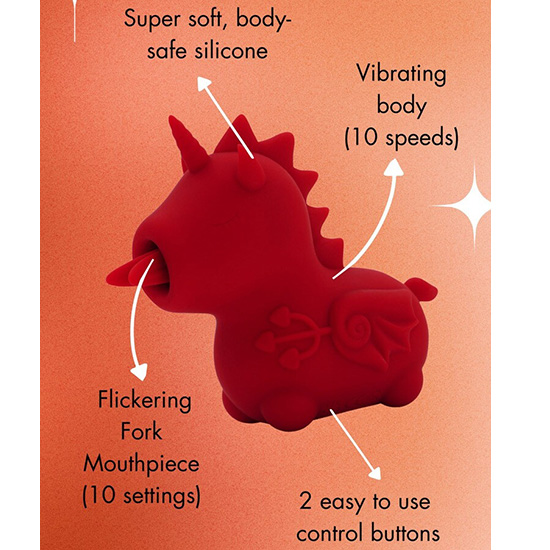 O vibrador-estimulador Blaze Diablo (língua acariciadora dupla) da Unihorn tem a forma de um pequeno unicórnio.