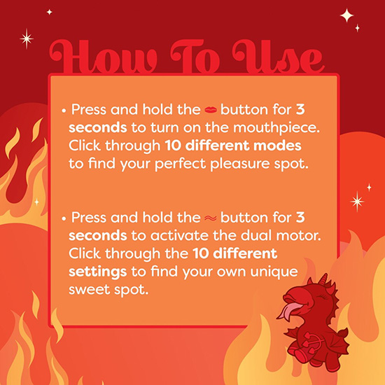 Além disso, vibrações intensas suportam esta estimulação única. O motor duplo silencioso e luxuoso fornece uma energia fiável. Os 10 modos diferentes de movimento e vibração da língua podem ser controlados separadamente com o toque de um botão.