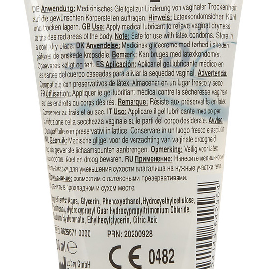 É seguro para uso com preservativos de látex. Sem odor ou sabor. O pantenol acalma a pele e cria uma barreira cutânea. Ele também tem um efeito regenerador. O ácido hialurónico é hidratante e faz com que o gel fique realmente suave.