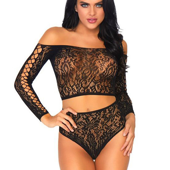 Conjunto de duas peças que inclui um top de renda curto com mangas compridas e uma tanga de cintura alta combinada