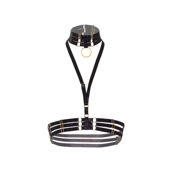 Um arnês moderno e elegante feito de cetim luxuoso, tiras elásticas.