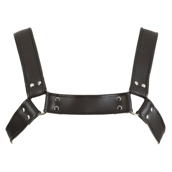 Harness para o peito feito em cabedal preto e argolas de metal.