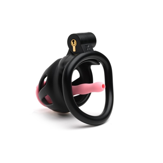 Este plug flexível e sonoro tem uma pequena vagina cor-de-rosa na frente para mostrar a sua verdadeira genitália e tem uma passagem para urinar enquanto permanece preso.