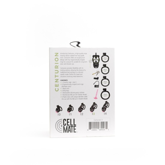 A sua gaiola Cellmate Centurion vem com um cadeado tradicional com duas chaves, bem como um pino adaptador especial de plástico ABS, que permite trancar a gaiola no modo Stealth com uma das cinco fechaduras de plástico, cada uma equipada com um código de identificação único à prova de violação, ideal para viagens ou situações de detetor de metais. Os conjuntos de substituição com dez fechaduras descartáveis estão disponíveis separadamente.