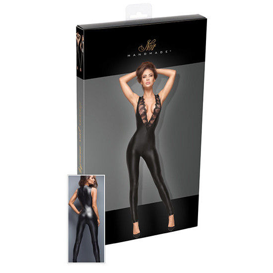 Fato inteiro justo, muito extensível que abraça a sua silhueta, em tecido preto acetinado matte.